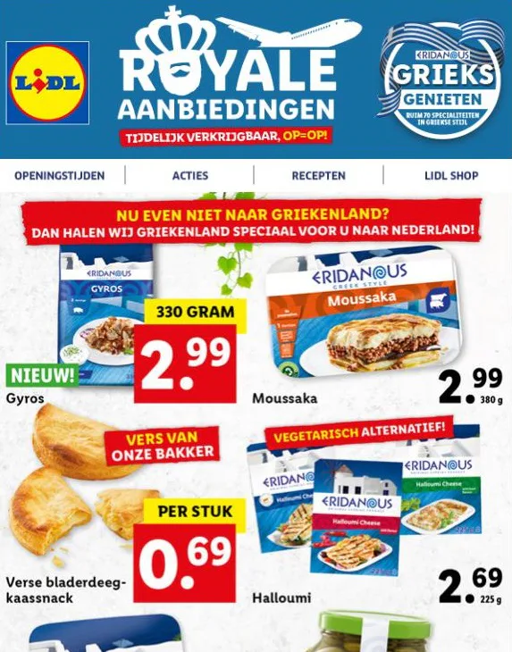 Deze week heeft Lidl tijdelijk ruim 70 Griekse producten in het assortiment. Online noemt Lidl de producten 'Royale aanbiedingen', nadat koning Willem-Alexander en zijn gezin hun vakantie heeft afgebroken in Griekenland. In de onlinenieuwsbrief van Lidl promoot de discounter de producten met de begeleidende tekst: 'Nu even niet naar Griekenland? Dan halen wij Griekenland speciaal voor u naar Nederland.'