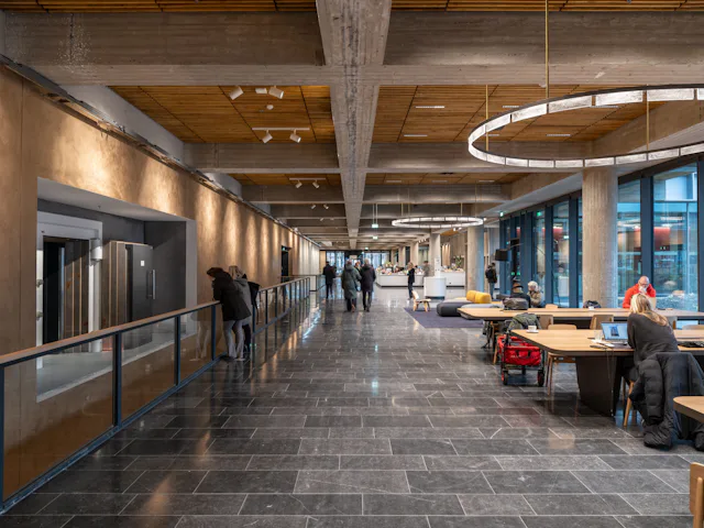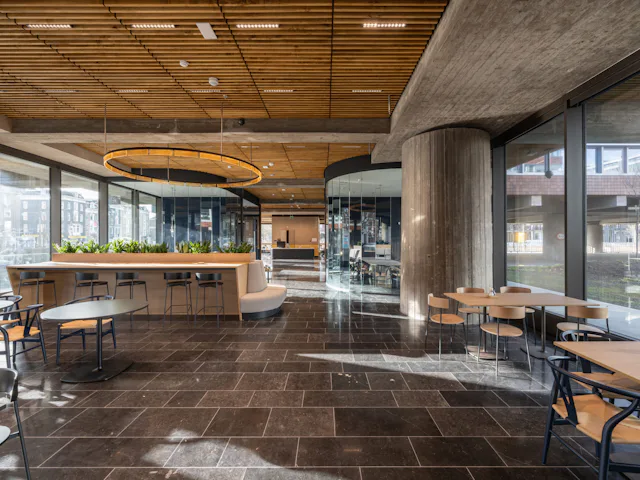 Het kantoor van DNB beschikt over vier soorten werkplekken: open werkplekken met en zonder beeldscherm, omsloten overlegplekken, ondersteunende ruimtes voor ontspanning en aanvullende ontmoetingsplekken, zoals het restaurant, de tribunetrap en het ontvangstgebied. Deze werkplekken verschillen in grootte, soort meubilair en voorzieningen.